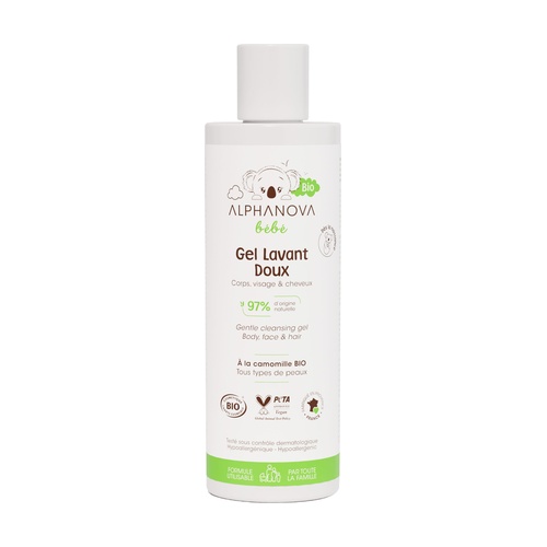 Alphanova Eco dermotisztító fürdőgél egy habzó, szappanmentes, hipoallergén gél, ökológiai tanúsítvánnyal a mindennapi zuhanyzáshoz vagy fürdéshez a babád és gyermekeid számára.