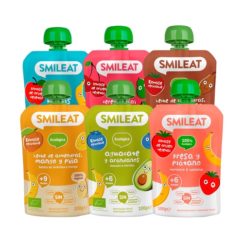 - Bio eper- és banántasak 6 hónapos kortól: Smileat finom, 100% bio eper- és banánpüré cukor hozzáadása nélkül +6 hónapos kortól.