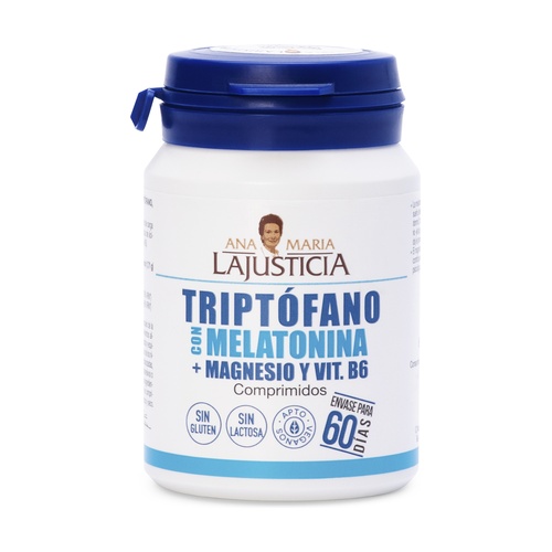 Triptofán melatoninnal + magnéziummal és B6-vitaminnal az Ana Maria Lajusticia-tól melatoninnal megerősítve, ami hozzájárul a pihenés és a test és az elme természetes cirkadián ritmusának javításához.
