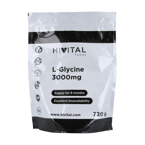 Hivital L-glicin 3000 mg egy L-glicin alapú étrend-kiegészítő por formájában, 100%-ban vegán, a glicin természetes édes ízével, adalékanyagok, mesterséges aromák és édesítőszerek nélkül. A glicin hozzájárul a kollagén szintéziséhez, az idegrendszer egyensúlyához, valamint a vér stabilitásához és működéséhez.