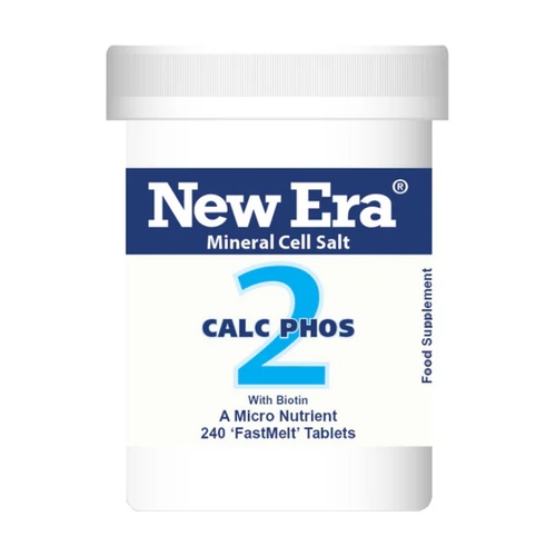 A New Era egysejtű sejtsója 2-es számú CALC PHOS-t (kalcium-foszfátot) tartalmaz. Finoman őrölt, apró sejtsó részecskéket tartalmaz "FastMelt" tablettákban, amelyek könnyen emészthetők és a nyelven oldódnak fel, biotinnal, egy alapvető tápanyaggal.