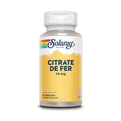 A Solaray Vas 14 mg egy étrend-kiegészítő kapszula formájában, vas-citrát alapú, amely segít a vashiány leküzdésében (terhesség, vérszegénység, fáradtság...).