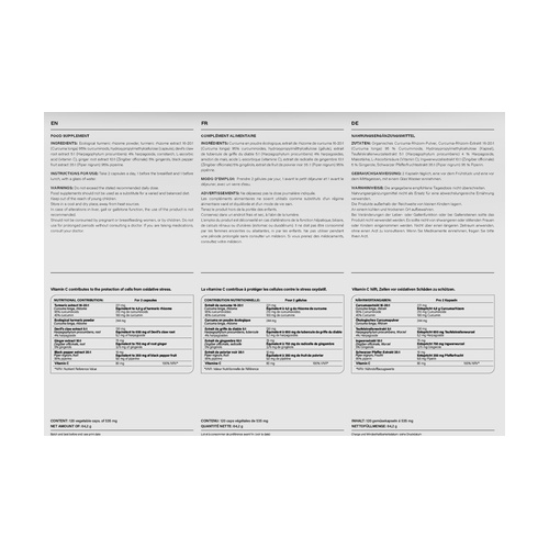 2 kapszulára vonatkozóan: Kurkuma kivonat (221 mg), amely megfelel 4 g kurkuma rizómának, ebből kurkuminoidok (210 mg) és kurkumin (100 mg), bio kurkuma por (244 mg), harpagofiton kivonat (130 mg), amely megfelel 650 mg harpagofiton gyökérnek, ebből harpagozidok (5,2 mg), gyömbér kivonat (75 mg), amely megfelel 750 mg gyömbér gyökérnek, ebből gingerolok (3,75 mg), fekete bors kivonat (10 mg), amely megfelel 350 mg fekete bors gyümölcsnek, ebből piperin (9,5 mg), C-vitamin (80 mg).