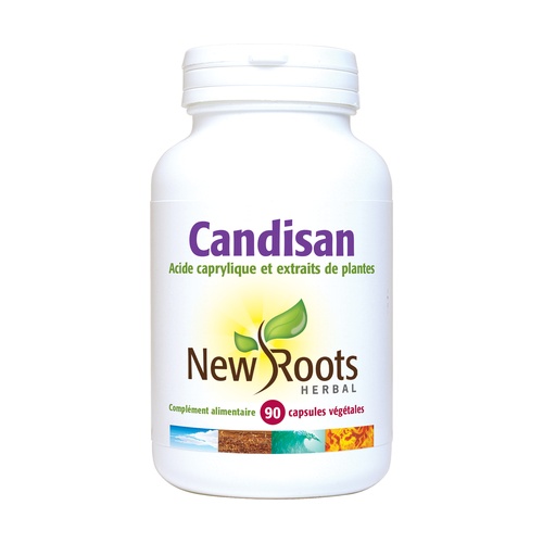 A New Roots Herbal Candisan szinergikus formula, amely különböző formájú kaprilsavat, magas koncentrációjú növényi kivonatokat (szagtalanított fokhagyma, grépfrútmag, oregánó kivonat, suma, echinacea, pau d'arco, diófa) és szelént tartalmaz.