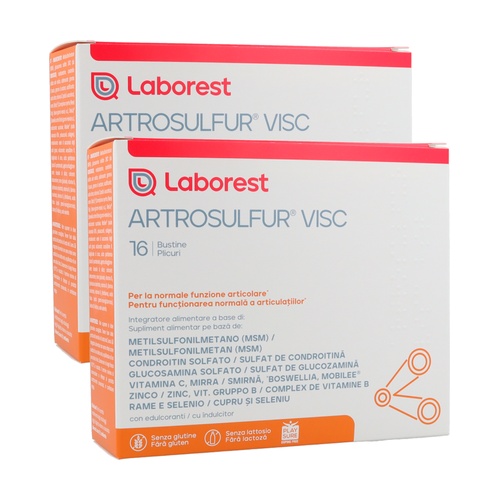Laborest Artrosulfur visc csomag egy táplálékkiegészítő, amely metilszulfonilmetán (MSM), kondroitin-szulfát, glükózamín-szulfát, C-vitamin, mirha, boswellia, Mobilee, cink, B-vitaminok, réz és szelén alapú.