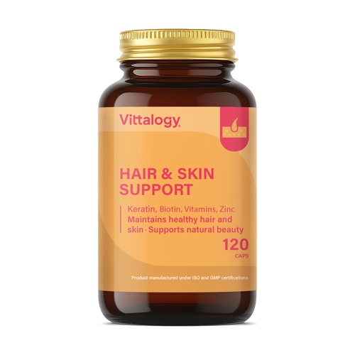 A Vittalogy Hair & Skin support egy táplálékkiegészítő, amely belülről hatva javítja a haj és a bőr egészségét és megjelenését. A biotin, cink, MSM, hialuronsav, C-vitamin és olyan kivonatok, mint a köles vagy a bambusz kombinációjának köszönhetően segít csökkenteni a hajhullást, növelni a fényt és erősíteni a fejbőrt. Emellett hozzájárul a kiegyensúlyozottabb, hidratáltabb és az oxidatív stresszel szemben védettebb bőrhöz.