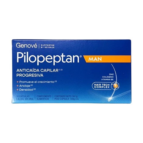 Pilopeptan Man kapszulák egy táplálékkiegészítő, amely hozzájárul a fokozatos hajhullás megelőzéséhez. Cinkkel, kollagénnel és B5-vitaminnal.