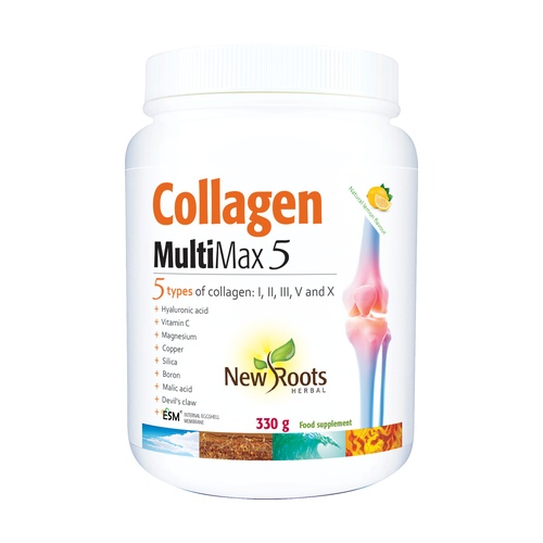 Erőteljes kollagénkeverék, amelyet vitaminokkal, ásványi anyagokkal és nutraceutikumokkal erősítettek meg. A New Roots Herbal Collagen MultiMax 5 ötféle bioaktív kollagénpeptidet tartalmaz (I, II, III, V és X típusokat), amelyek főként a csontokban, inakban, porcokban és a bőrben találhatók meg.