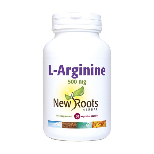 New Roots Herbal L-Arginin, egy táplálékkiegészítő, amely L-arginint tartalmaz kapszulánként 500 mg mennyiségben, szabad és természetes formában.