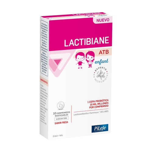 A Pileje Lactibiane ATB Enfant egy táplálékkiegészítő, amely 1 probiotikus törzset tartalmaz, kapszulánként 10 milliárd dózisban. Probiotikus törzs: Lacticaseibacillus rhamnosus GG LA801