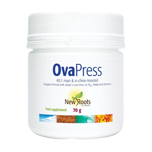 New Roots Herbal OvaPress egy táplálékkiegészítő mio- és quiroinositol, acetil-L-karnitin, B12-vitamin, folát és króm alapanyagokból. A króm hozzájárul a normál vércukorszint fenntartásához.
