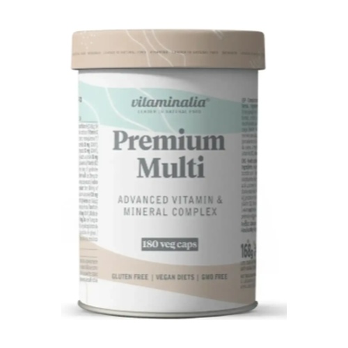 A Vitaminalia prémium multivitaminja egy vitaminokból, ásványi anyagokból, koenzim Q10-ből, kolinnal stabilizált ortoszilikát savból (kolin + szilícium) és foszfatidil-szerinből álló táplálékkiegészítő. Vitaminok (teljes spektrum), ásványi anyagok (vas, jód, magnézium, króm, kalcium, szelén, szilícium, bór, cink és réz), kolin, koenzim Q10, szilícium és foszfatidil-szerin.