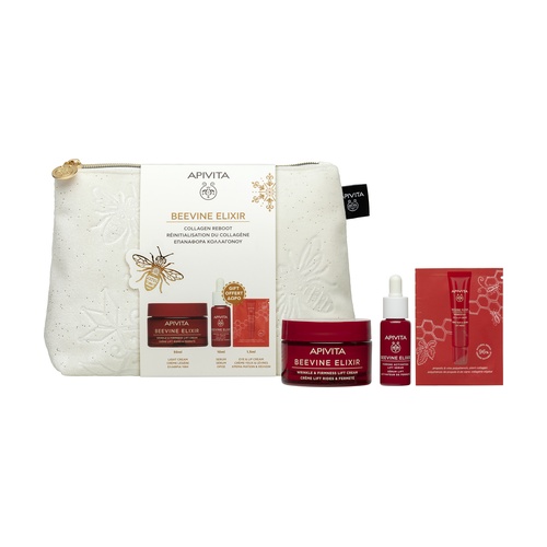 Beevine Elixir könnyű textúrájú krém + Apivita ajándékok csomag, Hidratáló és selymes öregedésgátló arckrém, amely feltölti a ráncokat, feszesebb bőrt biztosít és újradefiniálja az arc ovális formáját. Hidratál, feszesít és erősíti a bőr rugalmasságát.