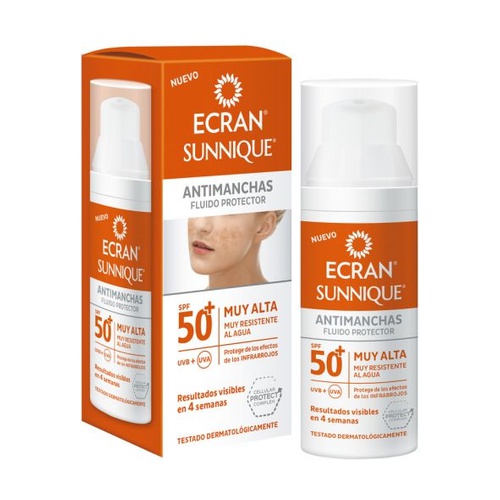 Az Ecran Sunnique foltok elleni arcvédő fluid SPF50+ egy védőfolyadék, amely megelőzi a bőrön a foltok megjelenését.