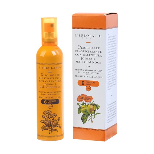 Calendula és Jojoba rugalmasságolaj Di L'Erbolario Alacsony védőhatású száraz testolaj a gyors és intenzív barnulásért. Nem zsíros, vízálló. Körömvirággal.