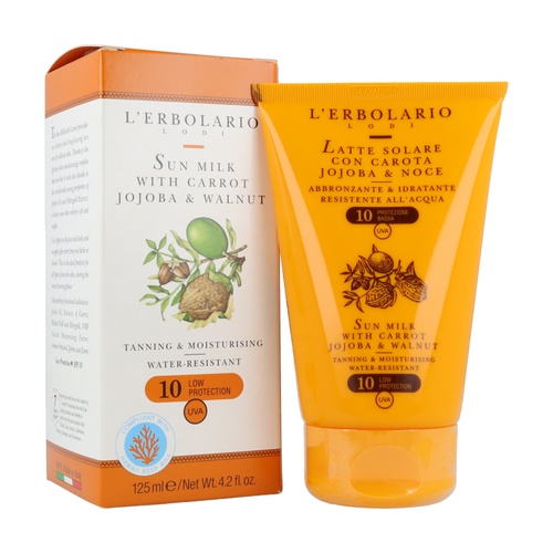 Testtej SPF 10 Sárgarépa, Jojoba és Dió L'Eerbolario naptej alacsony védelemmel arcra és testre, gyorsan felszívódó és vízálló, Sárgarépával, Jojobával és Dióval