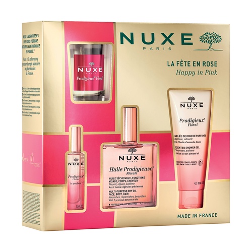 Ez a Prodigieux floral csomag tartalmaz egy illatos tusfürdőt, egy parfümöt, egy illatos gyertyát és a látványos Huile Prodigieux olajat – egy csomag, amely elbűvöli az érzékeket virágos illatokkal és vidám jegyekkel.