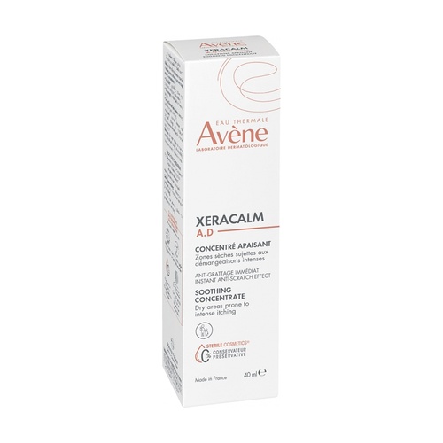 Az Avène Xeracalm A.D nyugtató koncentrátum steril kozmetikum azonnal enyhíti a helyileg jelentkező erős viszketés és kellemetlen érzés érzetét, csökkenti az intenzív szárazság fellángolásait.