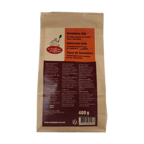 A La Droguerie Écologique száraz folteltávolítója, a Terre de Sommières, por alakú agyagként jelenik meg, amely gyakran okkerszínű (bár különböző árnyalatok léteznek: fehértől a liláig, világosbarnán és zöldön át). Ez egy ultrafinom szmektit agyag, amely akár a saját súlyának 80%-át is képes felszívni vízből. Ez a föld kiváló száraz folteltávolító, amely nem hagy körvonalat zsíros foltokon (olaj, vaj, dízel, smink stb.) érzékeny felületeken, mint például textíliákon (még selymen is), bútorhuzatokon, de szőnyegeken, bőrökön, márványon, grániton, asztalosmunkán, padlókon (csempe, kő, parketta, beton) is. Számos más folttípust is felszív és semlegesít: vizeletet párnákon, borfoltokat terítőkön stb.