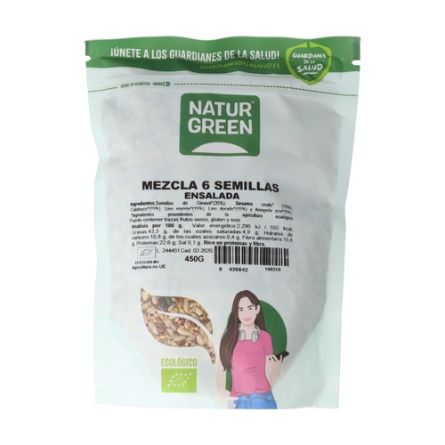 Napraforgómag* (35%), Nyers szezám* (15%), Tökmag* (15%), Barna lenmag* (15%), Arany lenmag* (15%), Kék mák* (5%).