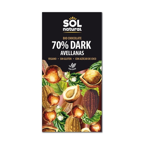 A Sol Natural bio 70%-os vegán étcsokoládé mogyoróval egy ízletes csokoládétábla, amelyet kókuszvirágcukorral édesítettek, ami az egyik legalacsonyabb glikémiás indexű édesítőszer. Egy ízletes étcsokoládé mogyoróval, amely intenzív és ropogós ízt kínál.