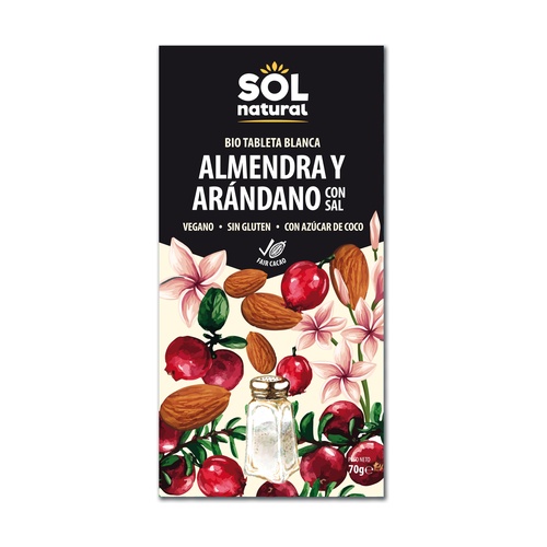 Fehércsokoládé tábla mandulával és áfonyával, 70 g, bio és vegán. Nem tartalmaz glutént, tejterméket, pálmaolajat vagy édesítőszereket.