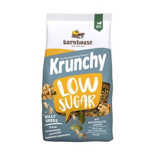 Ízletes krunchy müzli szezámmaggal, tökmaggal, lenmaggal és napraforgómaggal, alacsony cukortartalommal. Rostban gazdag. Vegán termék.