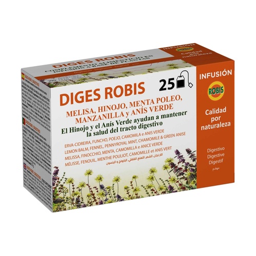 A Robis Bio Diges infúzió citromfűt, édesköményt, mentát, kamillát és bio zöld ánizst tartalmaz.