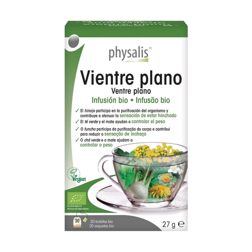 A Physalis Lapos hasű bio növényi infúzió ánizst tartalmaz, amely támogatja a szervezet tisztítását, és hozzájárul a gyomor és a has puffadásának csökkentéséhez. A citromfű, a borsmenta és a gyermekláncfű segítik a jó emésztést. A zöld tea és a mate támogatja a zsírégetést és részt vesz a testsúlykontrollban. Édes és kellemes ízű. A Physalis Lapos hasű-t feltétlenül egészséges és kiegyensúlyozott táplálkozással, valamint elegendő testmozgással kell kombinálni. Igyon naponta két liter vizet.