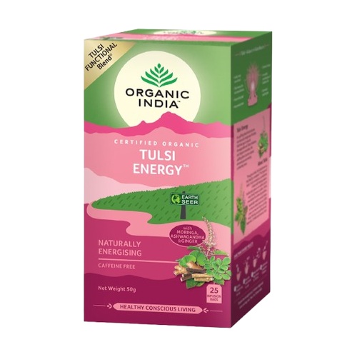 Organic India Tulsi Energy egy élénkítő ájurvédikus tea, amely természetes módon táplálja és energiával tölti fel a testedet. Moringával a táplálásért, ashwagandhával és tulsi-val az egyensúlyért, gyömbérrel az élénkítésért, továbbá gotu kola és amalaki jótékony hatásaival, valamint az édesgyökér, a borsmenta és a fodormenta ízével – ez a tea tökéletes választás, amikor a nap bármely szakában frissítő újrakezdésre van szükséged.