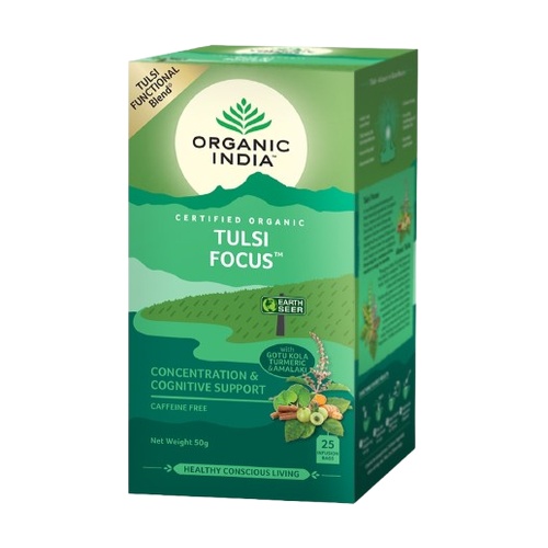 Organic India Tulsi Focus egy ájurvédikus tea, amely tele van a legjobb ájurvédikus gyógynövényekkel, amelyek serkentik az agyat a kognitív funkciók támogatására, a memória és a koncentráció javítására.