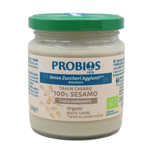 Probios 100%-os szezámmag tahini krém, kenhető krém hámozott szezámmagból, amely gazdag vitaminokban és ásványi anyagokban, só és édesítőszerek nélkül.