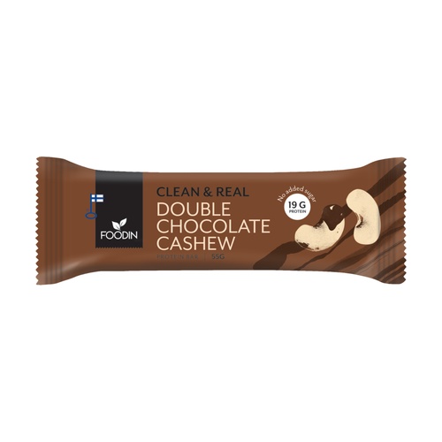 A Foodin Dupla Csokoládés Fehérjeszelet kesudióval ellenállhatatlan kombinációját kínálja az intenzív csokoládénak és a ropogós kesudiónak, magas fehérjetartalommal (19 g szeletenként) és hozzáadott cukor nélkül. Mély kakaóíze összhangban van a dió puhaságával, így ízletes és kiegyensúlyozott élményt nyújt.